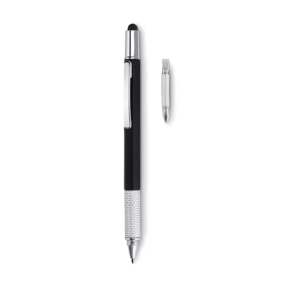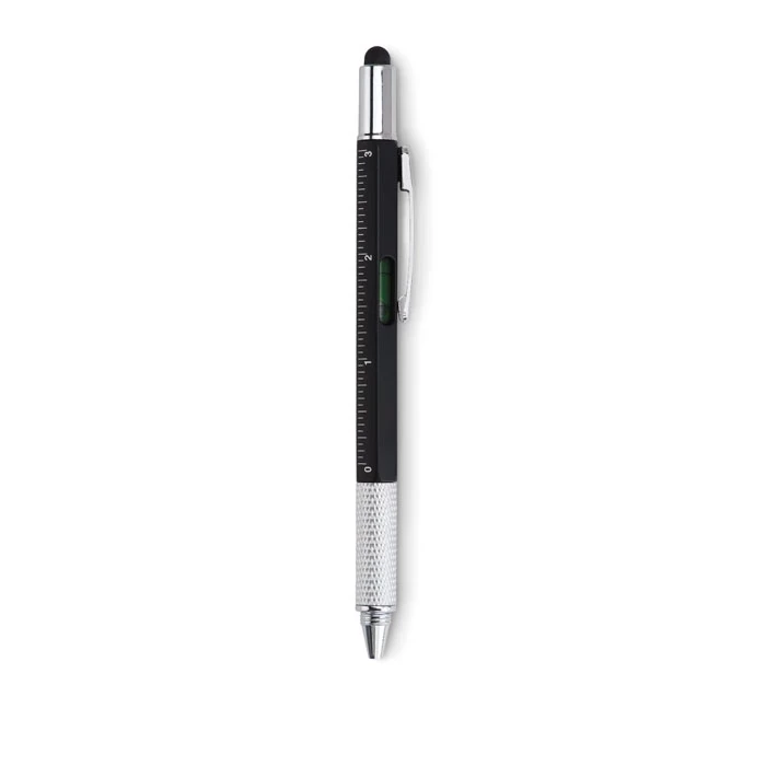 Przekręcany długopis z poziomicą. Wyposażony w linijkę, rysik oraz podwójny śrubokręt gwiazdka i płaski.